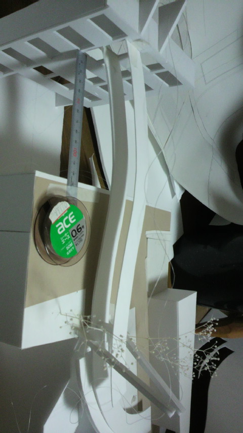 いつのまにやら課題②ですが、今回は吊り橋です。しかも片方は壁にくっついてて片方は浮いてる…浮いてる方はラーメンでもたせる階段で接地するんですが、階段と吊り橋はくっついていてはいけないという…しかも吊り橋の床板はくっついてる先の床高さより1m上がらないといけないというむちゃぶりです。構造上問題はないそうですが、私の頭の中で思考回路がショートしてしまうくらい複雑で、吊る方向とか高さとか、色々実験しなきゃいけないみたいです。時間無いというののに…